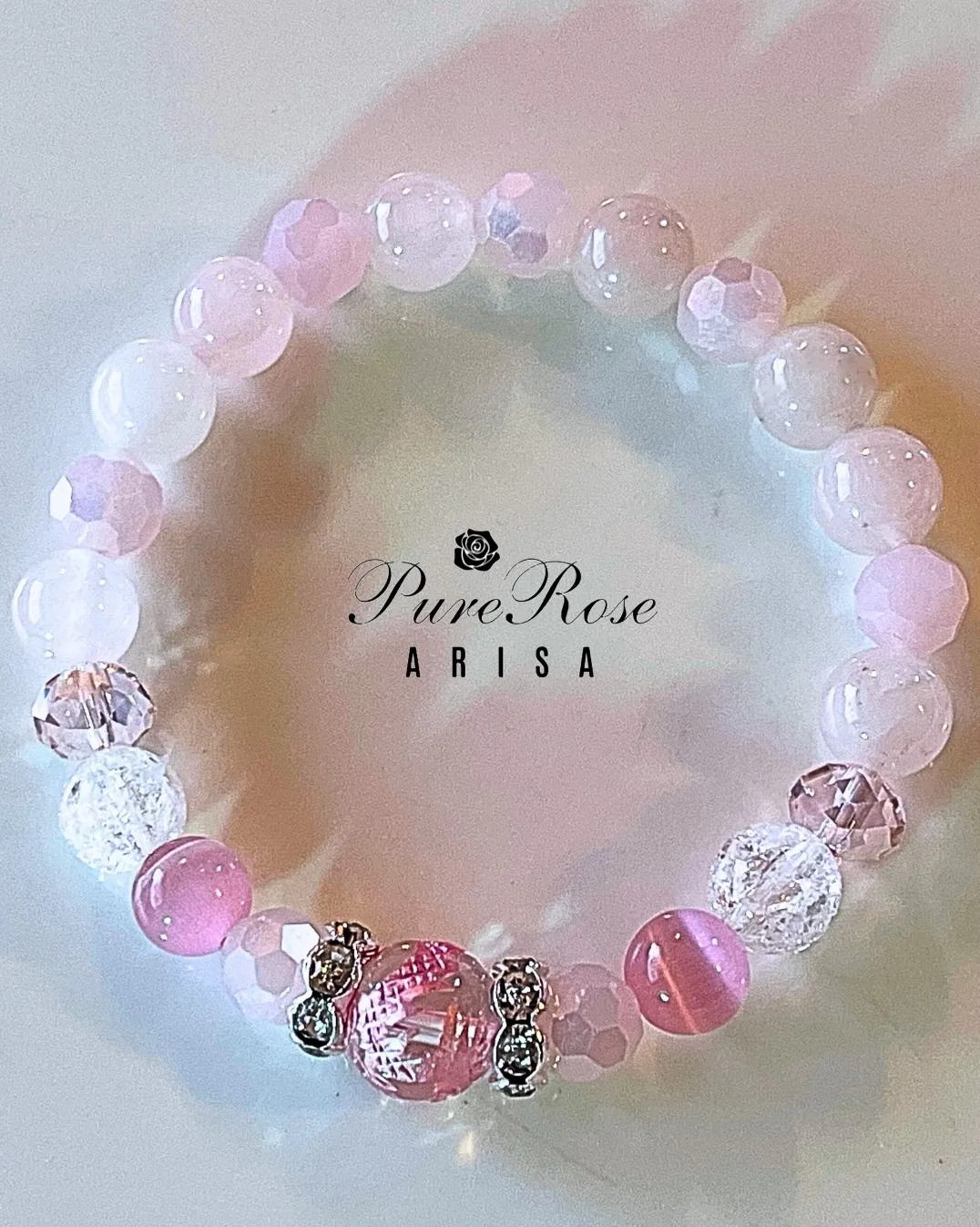 ピンクの龍彫り水晶とキャッツアイとローズクオーツの魅力UPブレスレット★茨城県Y.Y様